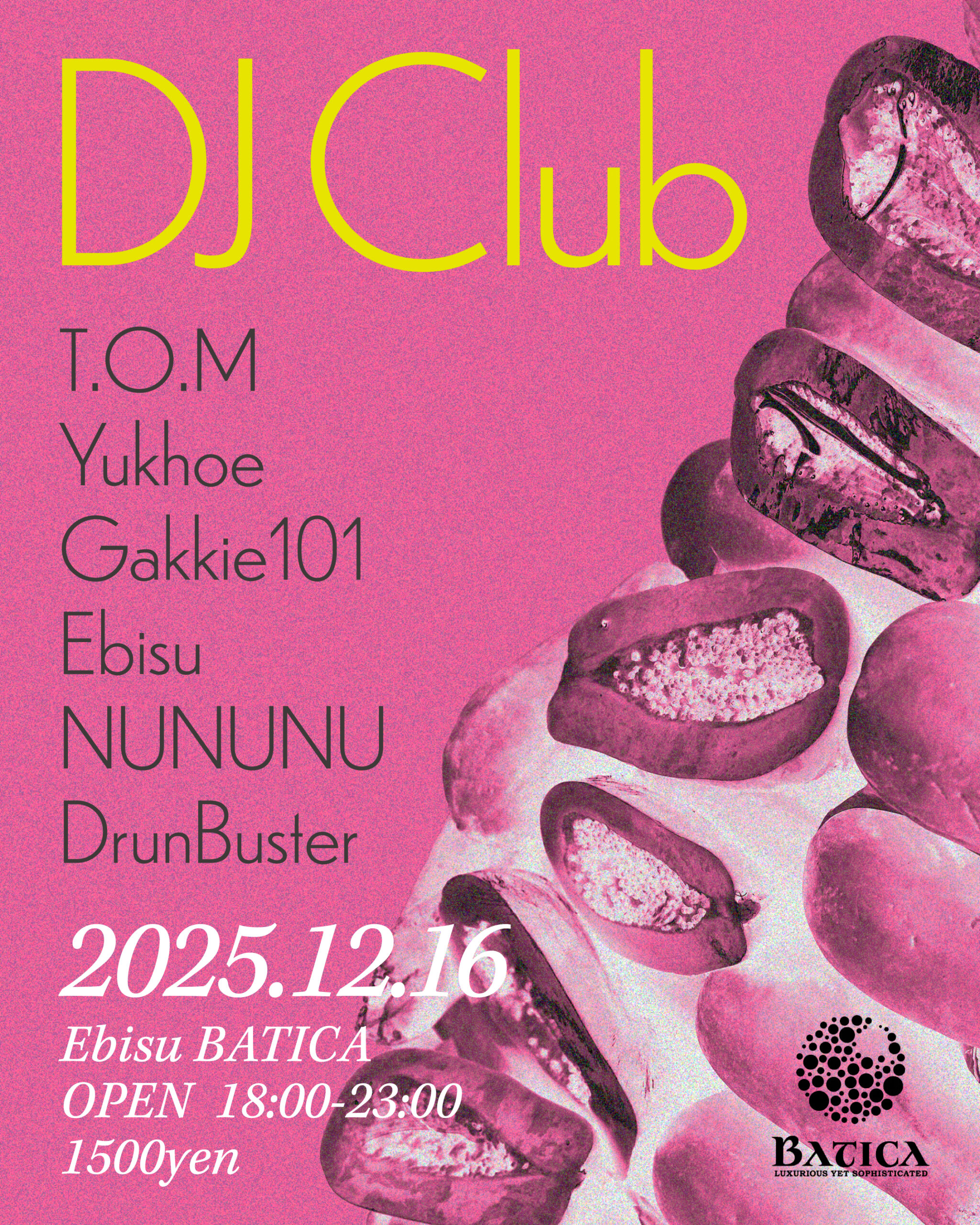 DJ Club 2025年12月16日(TUE) OPEN 18:00 / CLOSE 23:00 DOOR ¥1,500 ※1ドリンク代別